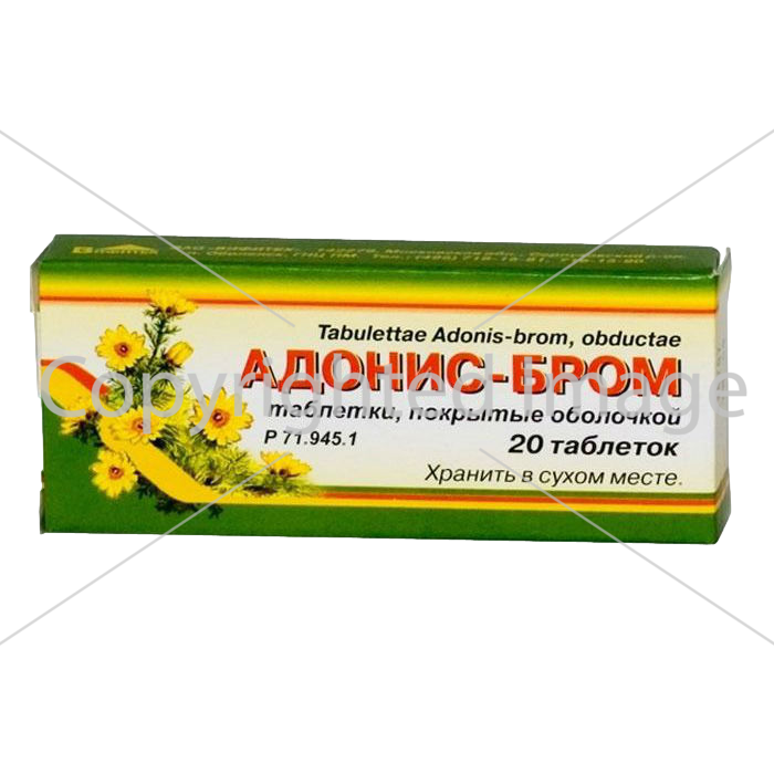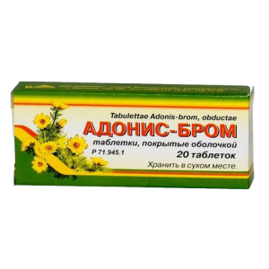 Адонис-бром – це лікарський препарат рослинного походження, що випускається у вигляді таблеток, вкритих оболонкою, по 20 штук у упаковці. Препарат має седативну та кардіотонічну дію, використовується при різних захворюваннях серця та нервової системи.