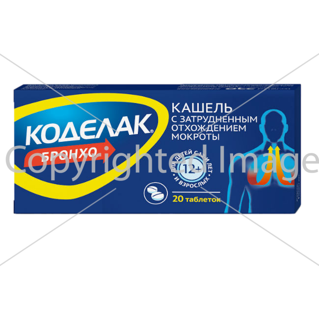 Коделак Бронхо таблетки 20 шт — комбінований лікарський засіб з відхаркувальним, муколітичним та протизапальним діями. Використовується для лікування кашлю, пов’язаного із захворюваннями дихальних шляхів із затрудненим відходженням мокроти.
